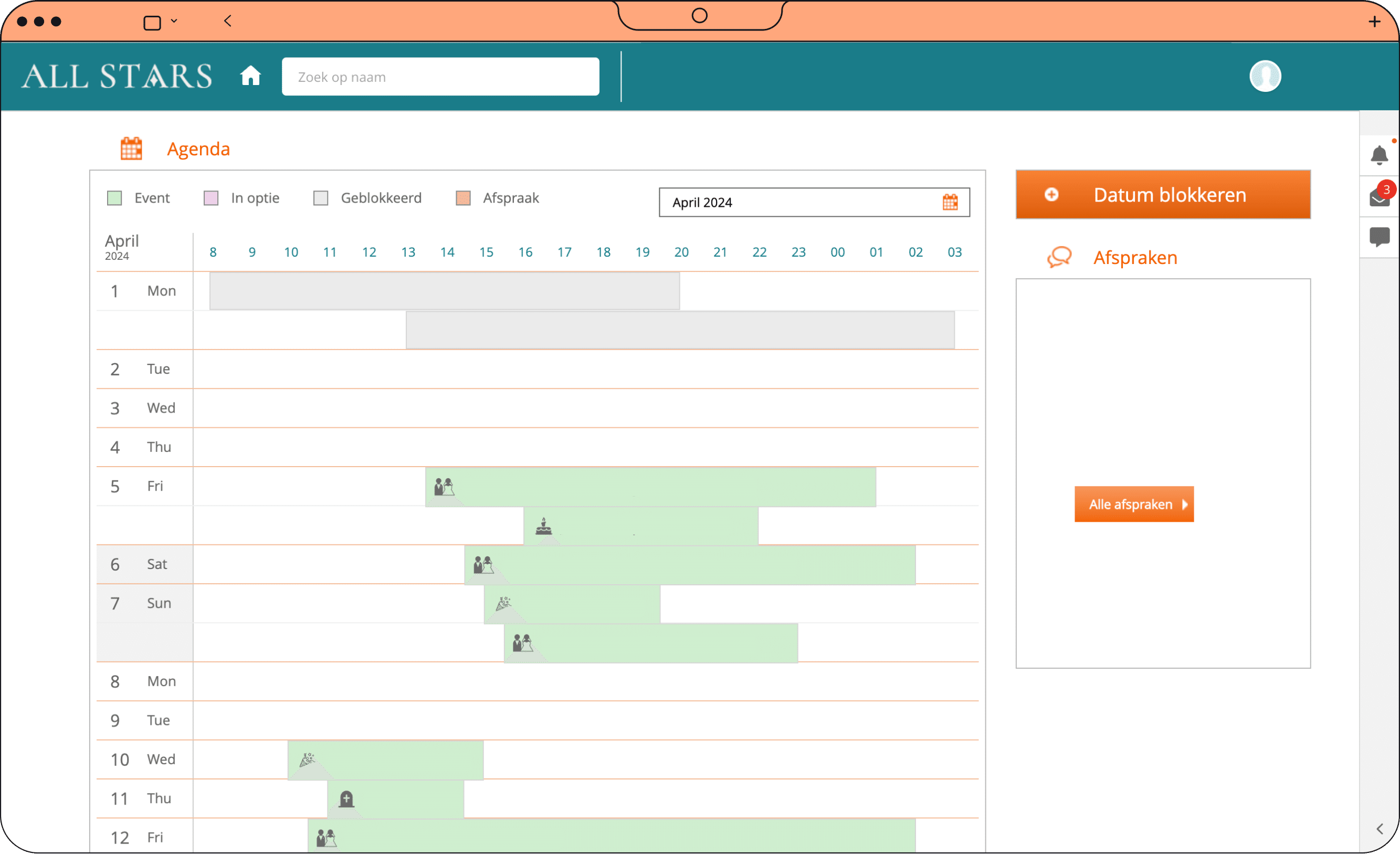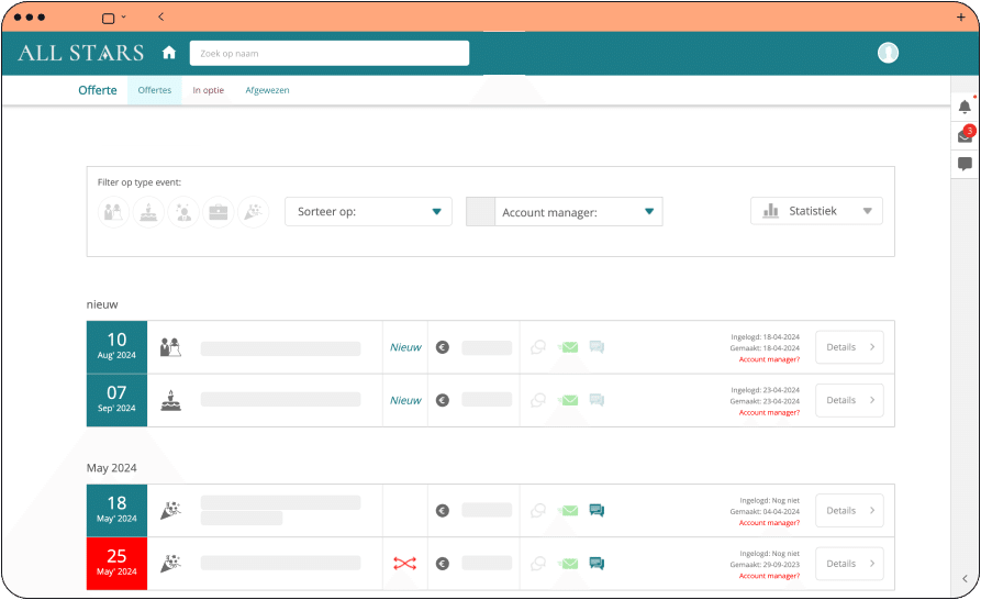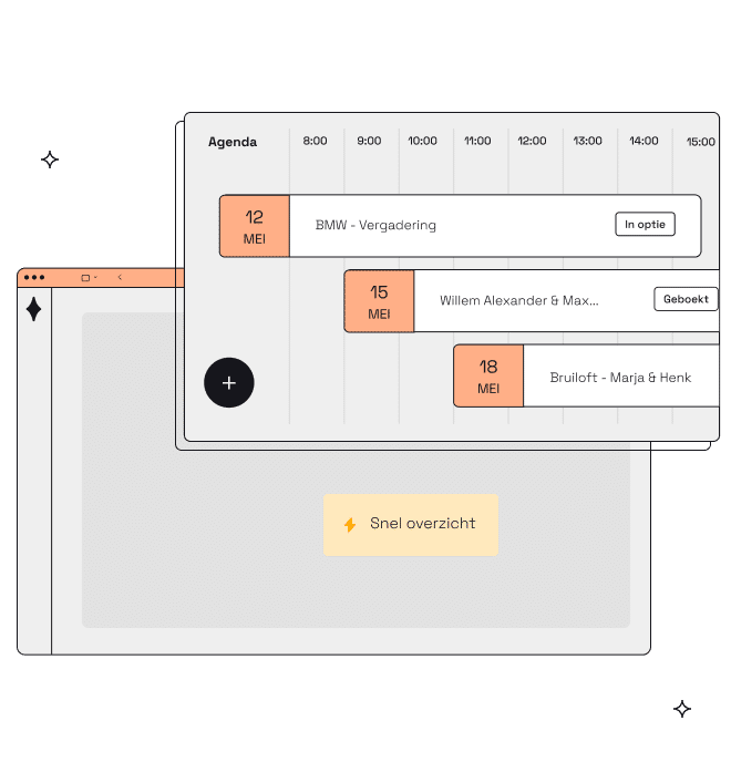 Al uw events en zalen in duidelijke maand- en dag overzichten! Beheer d.m.v. unieke functionaliteiten zoals het slepen van zalen.