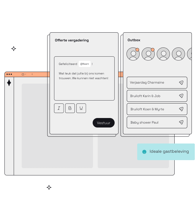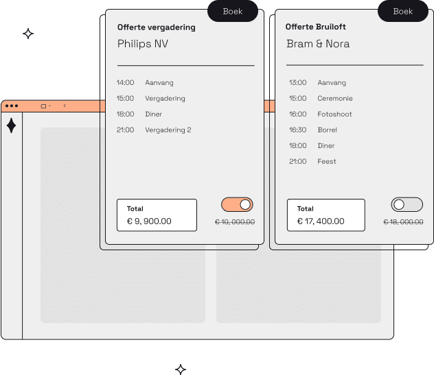 Maak ook van het offerte-traject een feestje. Nodig je gasten uit in jouw omgeving volledig gewijd aan hun evenement. Laat gasten online de offerte inzien, specifieke wijzigingen aanvragen of aanpassen. Of laat gasten zelf een nieuwe offerte maken.