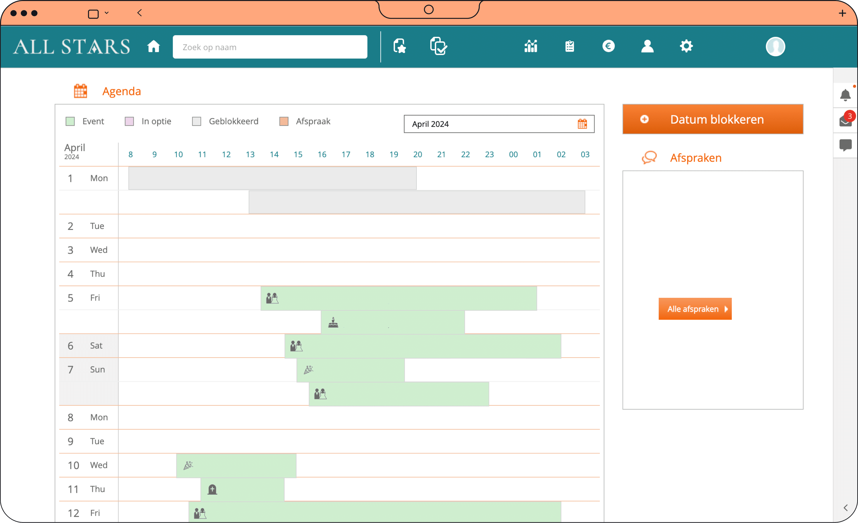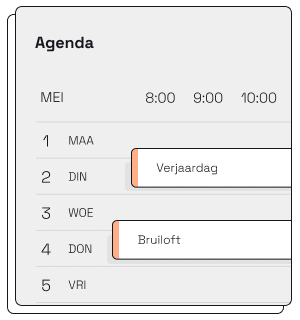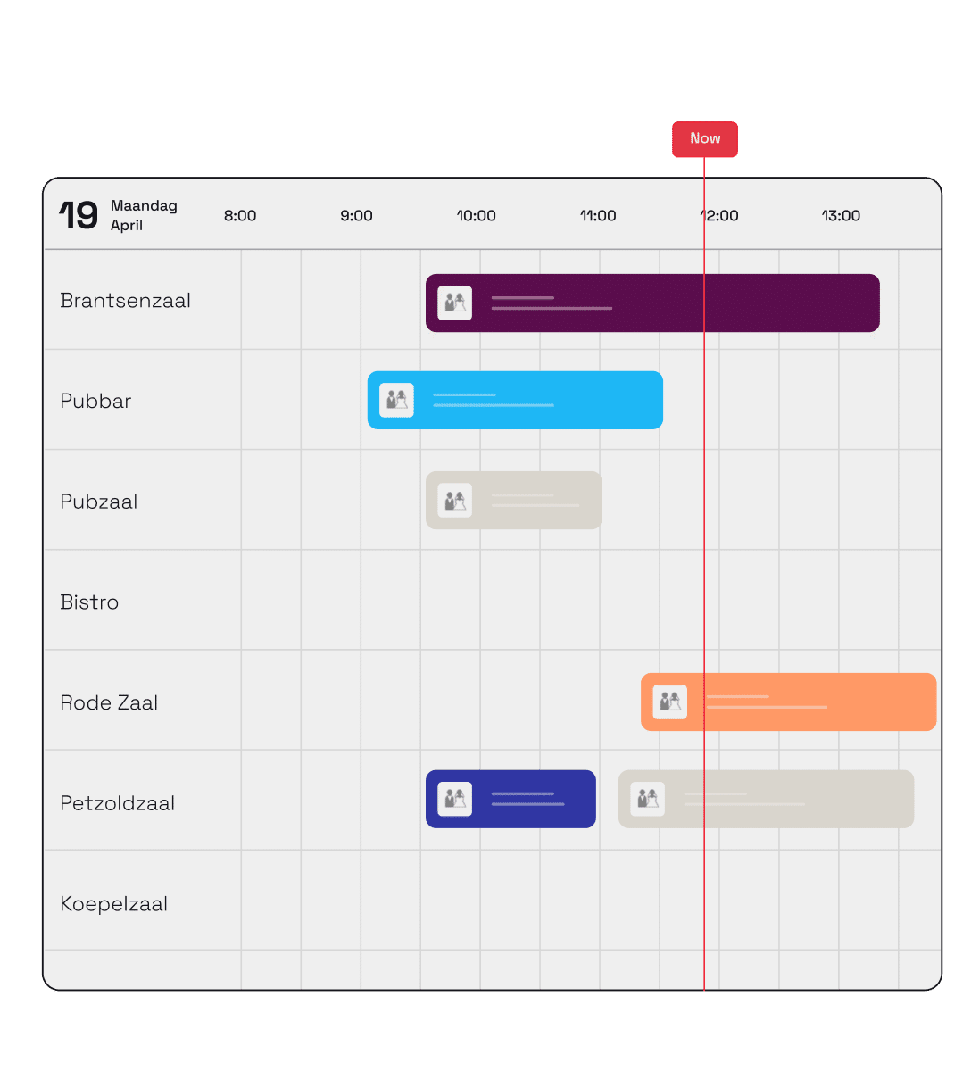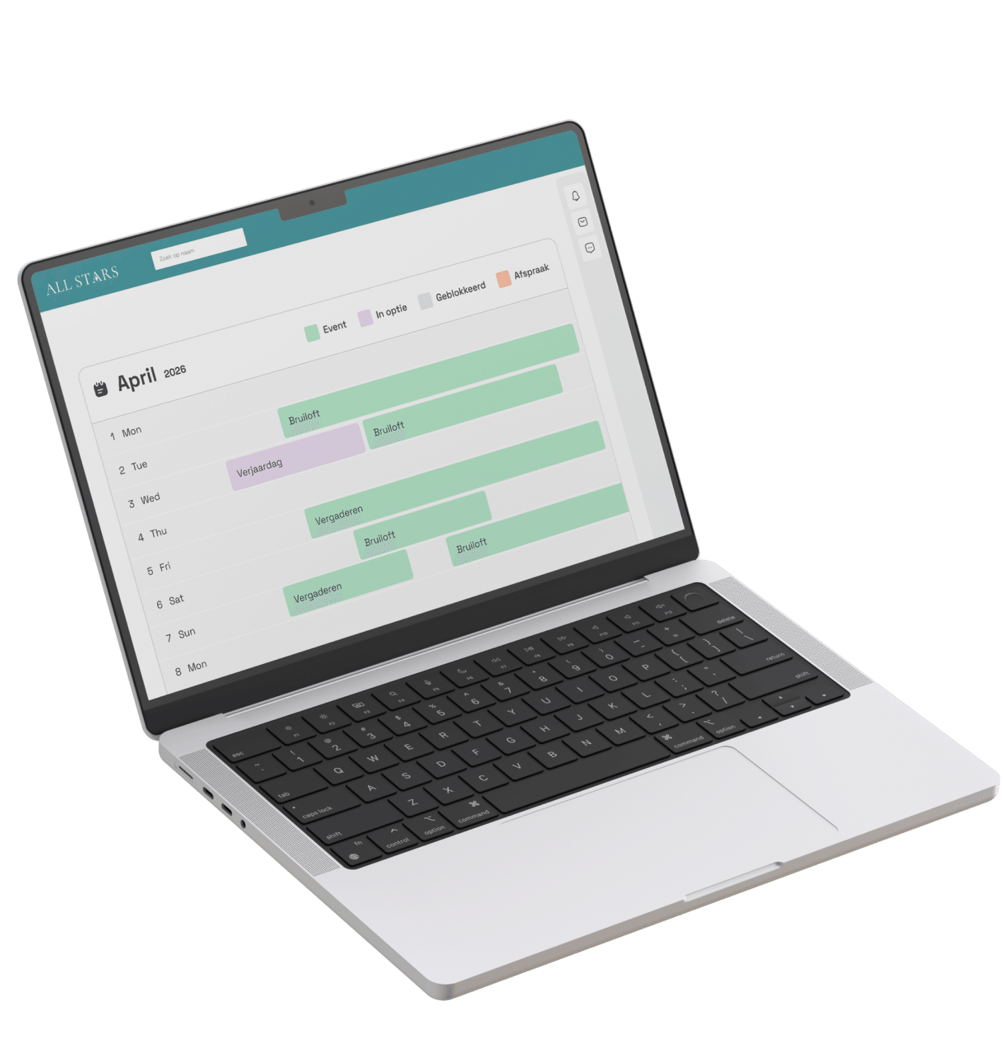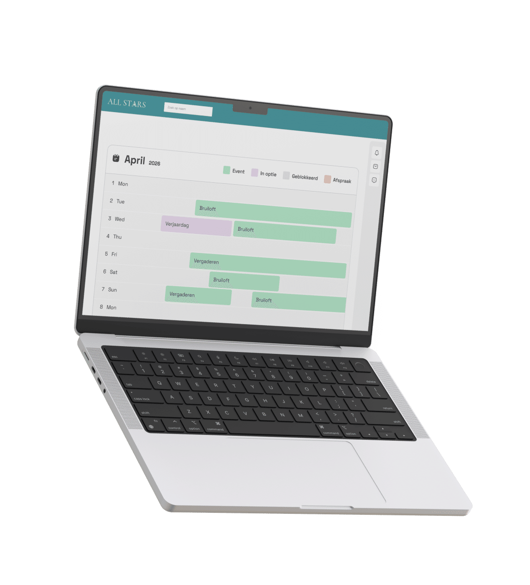 Of een dag, week, of maandagenda voor jou het best werkt... het maakt niet uit. Constell heeft het allemaal. En het best van allemaal? Met unieke tools voor events, zoals het slepen van zalen waarbij de zaalprijs direct opnieuw berekend wordt in de offerte.